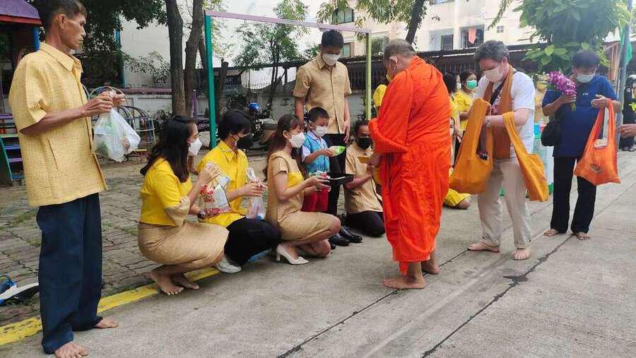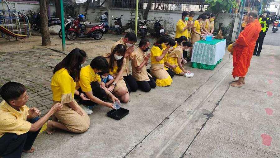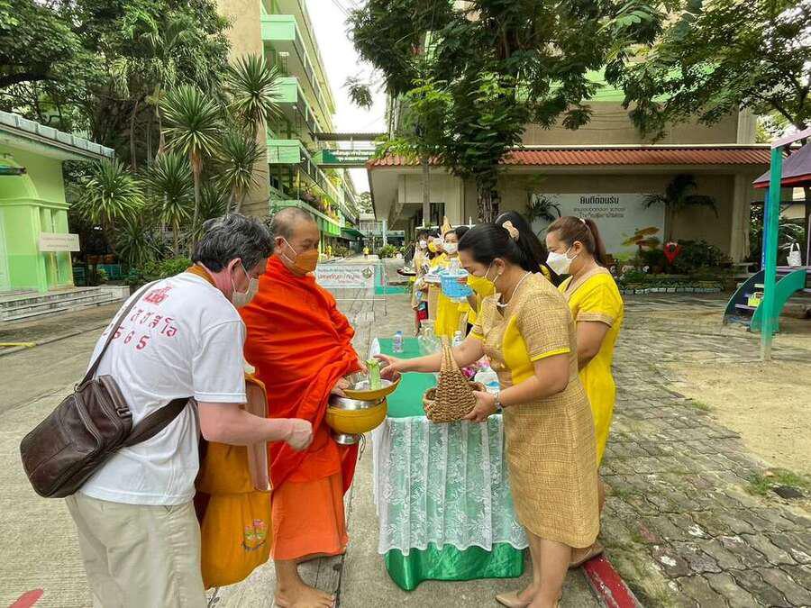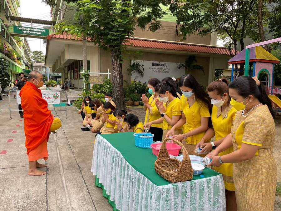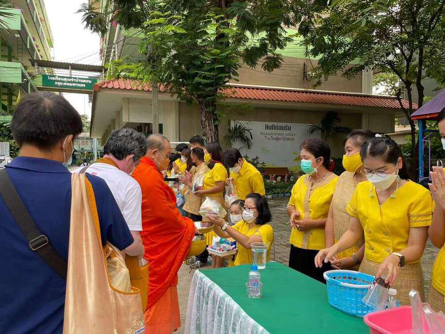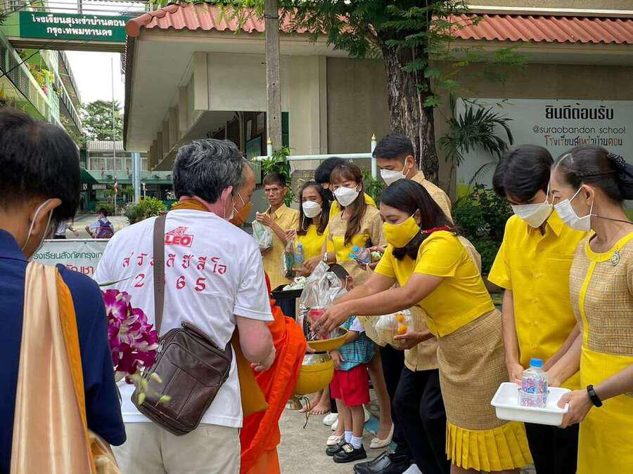 นางสาวสุทธิรัตน์ ฉัตรทิพา ผู้อำนวยการสถานศึกษา โรงเรียนสุเหร่าบ้านดอน นำข้าราชการครู-บุคลากร และนักเรียน ที่นับถือศาสนาพุทธ ทำบุญตักบาตรพระสงฆ์ ถวายเป็นพระราชกุศลแด่ พระบาทสมเด็จพระบรมชนกาธิเบศร มหาภูมิพลอดุลยเดชมหาราช บรมนาถบพิตร เนื่องในวันคล้ายวันพระบรมราชสมภพ วันชาติ และวันพ่อแห่งชาติ 5 ธันวาคม 2565 S:0